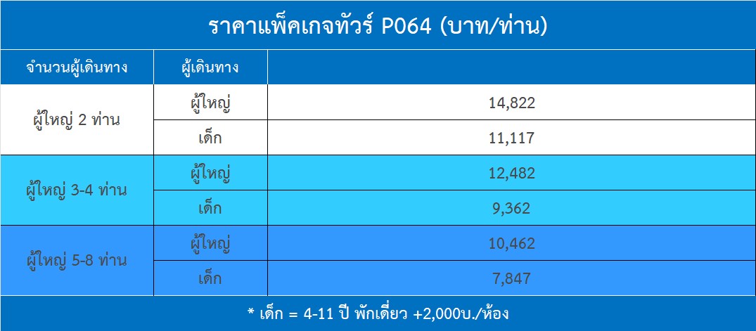- ทัวร์นี้ขอสงวนสิทธิ์ในการจองขั้นต่ำ 2 ท่าน